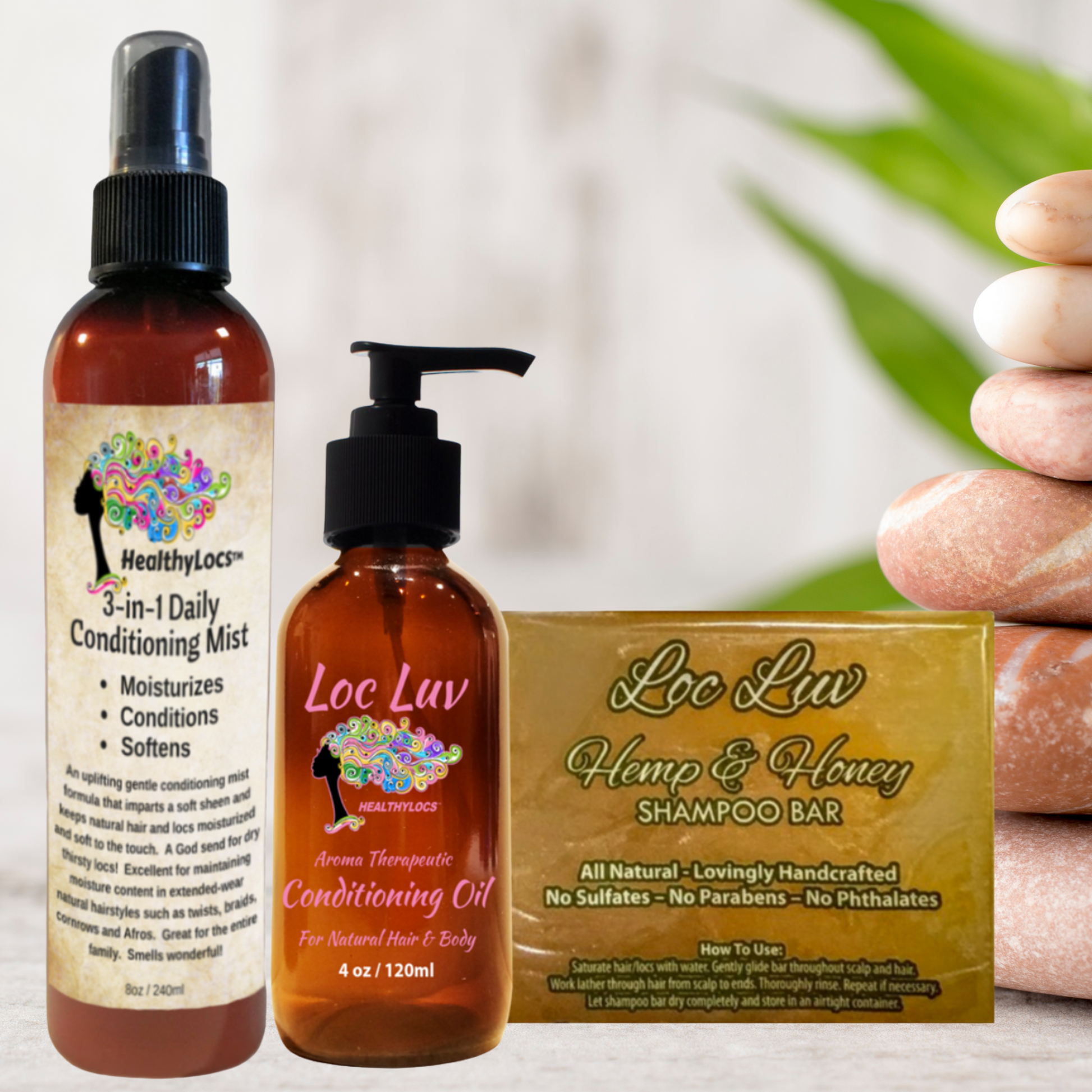 All of my new Sisterlocks (tm) and interloc clients are gifted with this set directly after their installation. An easy choice for hydration, conditioning, and cleansing for the loc newbie, all in one convenient set. It's easy to get overwhelmed when making your decisions on how to care for your new locs. Although the prevailing consensus is to not put anything on new locs, 25 years of transitioning women into long, soft, fragrant locs has proven that false. Our curly, kinky, coily hair loves moisture and conditioning, whether it's loc'd or not. The issue is finding the right products for your unique texture and loc'd style. These loc-loving products are formulated with the smaller locs in mind and contain gentle but effective hair-loving ingredients that are not heavy, won't contribute to buildup, and will keep your locs clean, incredibly soft, and smelling amazing. With daily maintenance, your locs are kept in a state of light moisture and conditioning in between your retightening and grooming sessions. Your loc journey deserves a great start. A big congratulations to YOU on your decision to finally loc your hair!